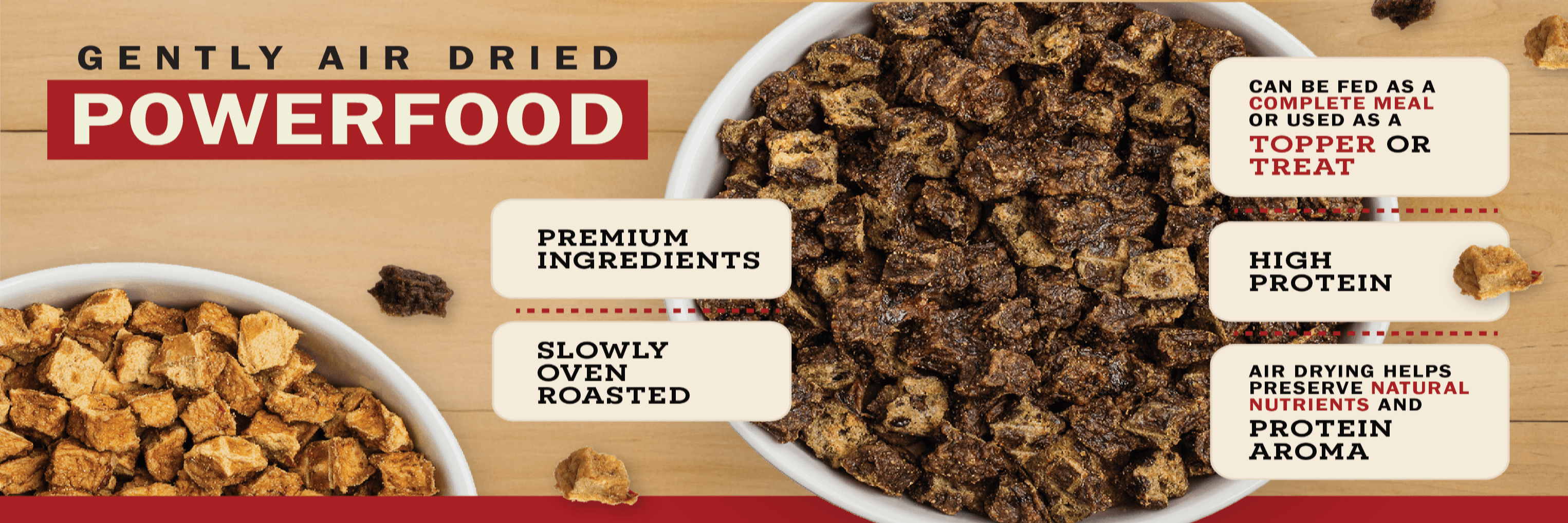 Made in small batches with real meat and carefully selected ingredients, our Gently Air-Dried Powerfood brings dogs back to what they crave most—rich flavor, real nutrition, and a bowl they can’t wait to finish. Gently prepared and free from grains, fillers, and artificial additives, it’s a cleaner, more natural way to feed your dog.